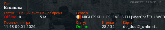 Играет на Counter Strike 1.6 сервере. Страна: РумынияПервый раз замечен 11:32 09.01.2026