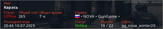 Играет на Counter Strike Source сервере. Страна: РоссияПервый раз замечен 17:21 30.03.2023