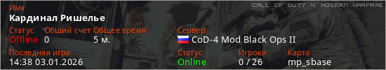 Играет на Call of Duty 4: Modern Warfare сервере. Страна: РоссияПервый раз замечен 14:34 03.01.2026