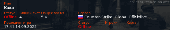Играет на Counter Strike Source сервере. Страна: РоссияПервый раз замечен 17:25 14.09.2025