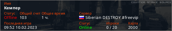 Играет на Counter Strike Source сервере. Страна: РоссияПервый раз замечен 08:09 10.02.2023