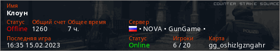 Играет на Counter Strike Source сервере. Страна: РоссияПервый раз замечен 12:38 06.11.2022