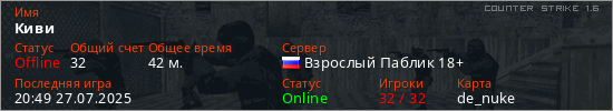 Играет на Counter Strike 1.6 сервере. Страна: РоссияПервый раз замечен 18:00 16.06.2025