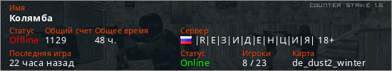 Играет на Counter Strike 1.6 сервере. Страна: РоссияПервый раз замечен 16:44 06.01.2021