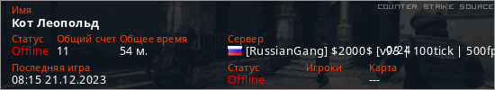 Играет на Counter Strike Source сервере. Страна: РоссияПервый раз замечен 11:41 15.09.2023