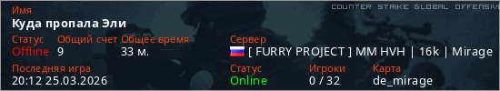 Играет на Counter Strike Global Offensive сервере. Страна: РоссияПервый раз замечен 21:36 08.03.2026