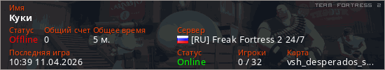 Играет на Team Fortress 2 сервере. Страна: РоссияПервый раз замечен 10:37 11.04.2026