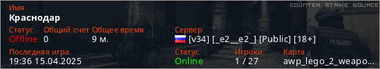 Играет на Counter Strike Source сервере. Страна: РоссияПервый раз замечен 11:14 02.12.2024