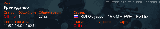 Играет на Counter Strike Global Offensive сервере. Страна: РоссияПервый раз замечен 13:55 11.04.2025