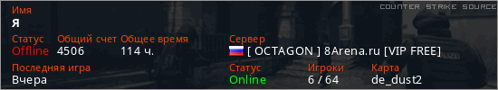 Играет на Counter Strike Source сервере. Страна: РоссияПервый раз замечен 08:25 23.12.2019
