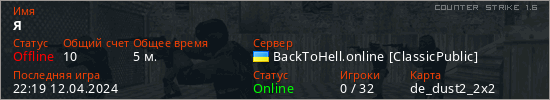 Играет на Counter Strike 1.6 сервере. Страна: УкраинаПервый раз замечен 22:17 12.04.2024