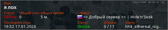 Играет на Counter Strike 1.6 сервере. Страна: РоссияПервый раз замечен 19:12 17.01.2026