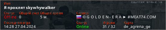 Играет на Counter Strike 1.6 сервере. Страна: РоссияПервый раз замечен 14:26 27.04.2024