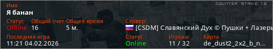 Играет на Counter Strike 1.6 сервере. Страна: РоссияПервый раз замечен 10:58 04.02.2026