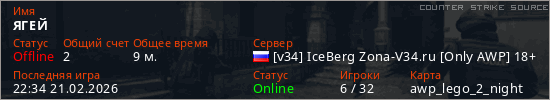 Играет на Counter Strike Source сервере. Страна: РоссияПервый раз замечен 21:49 19.02.2026