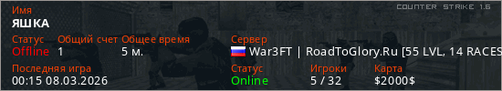 Играет на Counter Strike 1.6 сервере. Страна: РоссияПервый раз замечен 00:11 08.03.2026