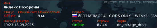 Играет на Counter Strike Global Offensive сервере. Страна: РоссияПервый раз замечен 19:15 18.09.2025