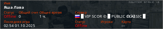 Играет на Counter Strike 1.6 сервере. Страна: РоссияПервый раз замечен 20:10 22.09.2025