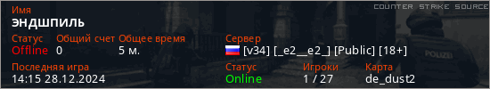 Играет на Counter Strike Source сервере. Страна: РоссияПервый раз замечен 14:07 28.12.2024