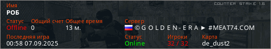 Играет на Counter Strike 1.6 сервере. Страна: РоссияПервый раз замечен 02:51 06.09.2025