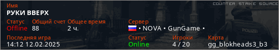 Играет на Counter Strike Source сервере. Страна: РоссияПервый раз замечен 12:59 26.01.2025