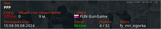 Играет на Counter Strike 1.6 сервере. Страна: РоссияПервый раз замечен 21:52 07.08.2024