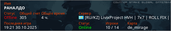 Играет на Counter Strike Global Offensive сервере. Страна: КазахстанПервый раз замечен 21:07 25.09.2025