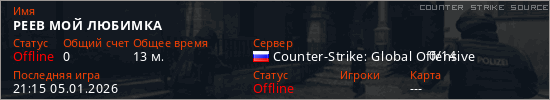 Играет на Counter Strike Source сервере. Страна: РоссияПервый раз замечен 16:23 25.11.2025
