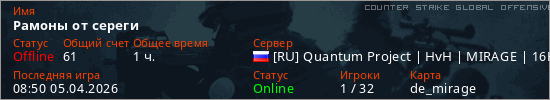Играет на Counter Strike Global Offensive сервере. Страна: РоссияПервый раз замечен 19:27 26.03.2026