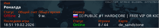 Играет на Counter Strike Global Offensive сервере. Страна: РоссияПервый раз замечен 17:07 16.09.2025