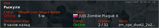 Играет на Counter Strike 1.6 сервере. Страна: РоссияПервый раз замечен 20:35 26.04.2026
