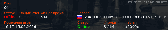 Играет на Counter Strike Source сервере. Страна: РоссияПервый раз замечен 16:05 15.02.2026