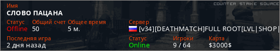 Играет на Counter Strike Source сервере. Страна: РоссияПервый раз замечен 17:08 30.03.2026