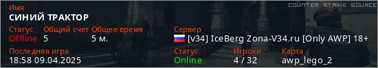Играет на Counter Strike Source сервере. Страна: РоссияПервый раз замечен 18:35 09.04.2025