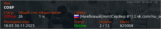 Играет на Counter Strike 1.6 сервере. Страна: РоссияПервый раз замечен 22:00 16.09.2024