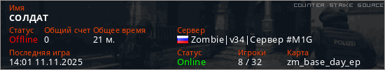 Играет на Counter Strike Source сервере. Страна: РоссияПервый раз замечен 09:05 08.11.2025