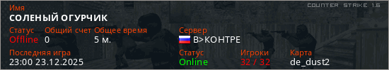 Играет на Counter Strike 1.6 сервере. Страна: РоссияПервый раз замечен 22:58 23.12.2025