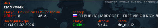 Играет на Counter Strike Global Offensive сервере. Страна: РоссияПервый раз замечен 06:33 21.08.2025