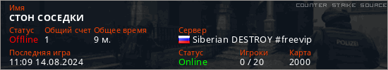 Играет на Counter Strike Source сервере. Страна: РоссияПервый раз замечен 10:51 14.08.2024