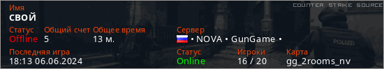 Играет на Counter Strike Source сервере. Страна: РоссияПервый раз замечен 15:45 23.05.2024