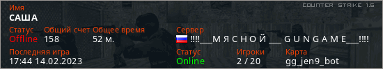 Последний раз был в сети 17:44 14.02.2023 Игрок с таким ником замечен на 29 серверах