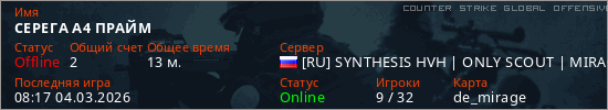 Играет на Counter Strike Global Offensive сервере. Страна: РоссияПервый раз замечен 07:49 04.03.2026