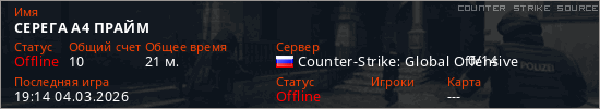 Играет на Counter Strike Source сервере. Страна: РоссияПервый раз замечен 15:05 04.03.2026