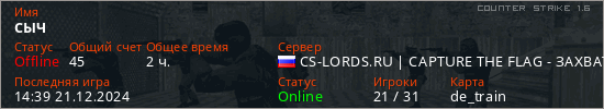 Играет на Counter Strike 1.6 сервере. Страна: РоссияПервый раз замечен 23:10 01.02.2024