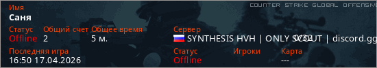 Играет на Counter Strike Global Offensive сервере. Страна: РоссияПервый раз замечен 16:42 17.04.2026
