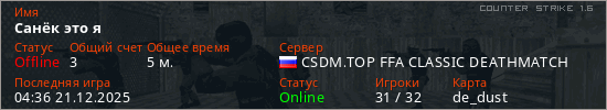 Играет на Counter Strike 1.6 сервере. Страна: РоссияПервый раз замечен 04:34 21.12.2025