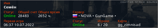 Играет на Counter Strike Source сервере. Страна: РоссияПервый раз замечен 06:37 10.07.2022