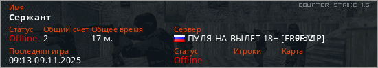 Играет на Counter Strike 1.6 сервере. Страна: РоссияПервый раз замечен 00:17 21.07.2025