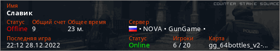 Играет на Counter Strike Source сервере. Страна: РоссияПервый раз замечен 15:31 10.11.2022