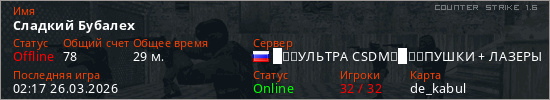 Играет на Counter Strike 1.6 сервере. Страна: РоссияПервый раз замечен 01:49 26.03.2026